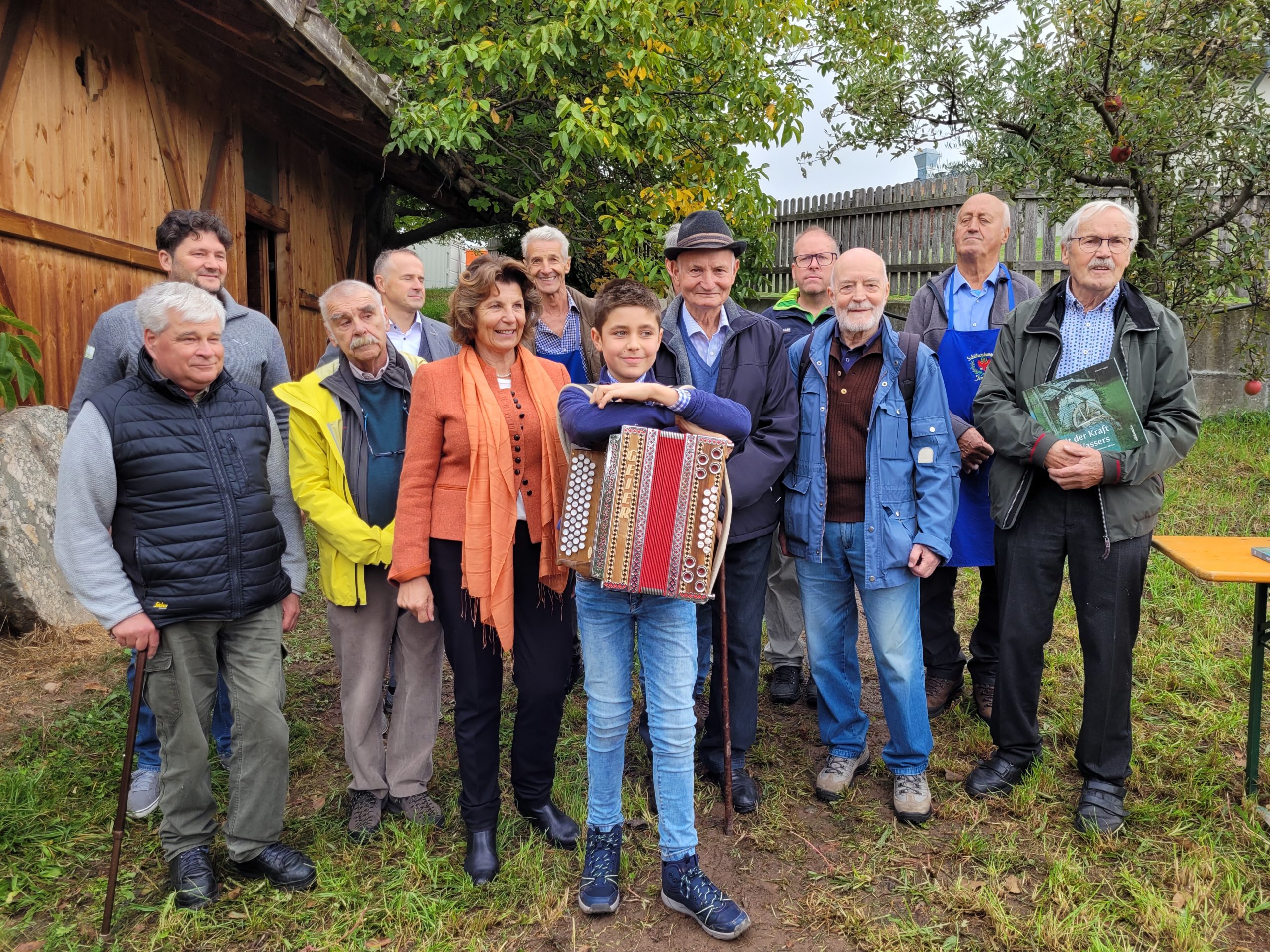 Anton Lanznaster vom Pichlerhof setzte dazu seine Mühle nach der langen und trockenen Sommerzeit wieder in Betrieb, so dass die Anwesenden das Klappern und Rauschen des Wasserrades und des Mahlwerkes miterleben konnten.